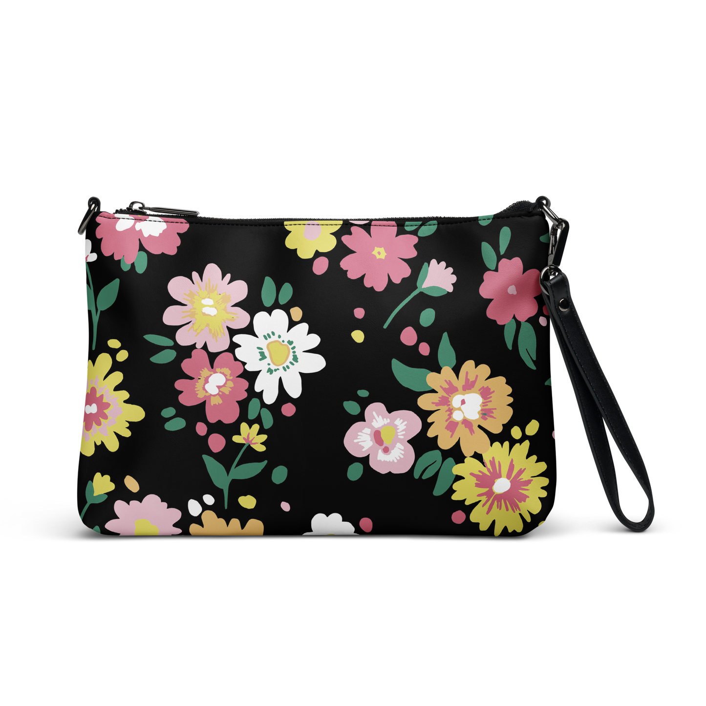 Bursting with cheery blossoms on a deep background, this crossbody bag is the perfect way to add a playful pop to any day or night look. Soft pinks, sunny yellows, and crisp greens come alive against the dark base, ensuring you carry a touch of floral joy with every outfit. Ideal for statement making moments.