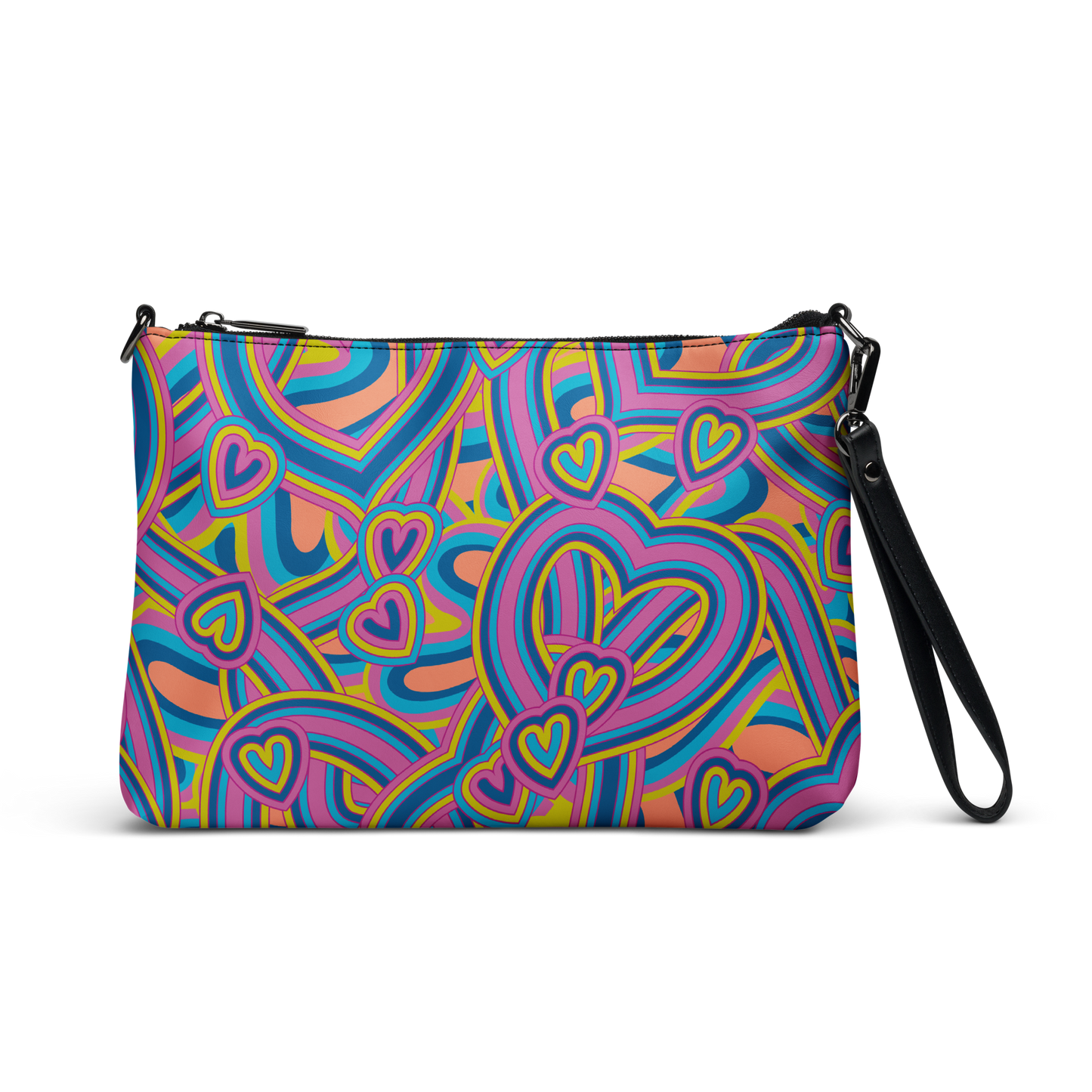 Spirals of electric color wind across this compact bag, accentuated with playful heart outlines in striking pink and yellow. The dazzling array of rainbow hues creates a lively accessory for any outing, instantly elevating your everyday essentials. Its modern design and swirling pattern are sure to attract attention and add a cheerful pop to every wardrobe.