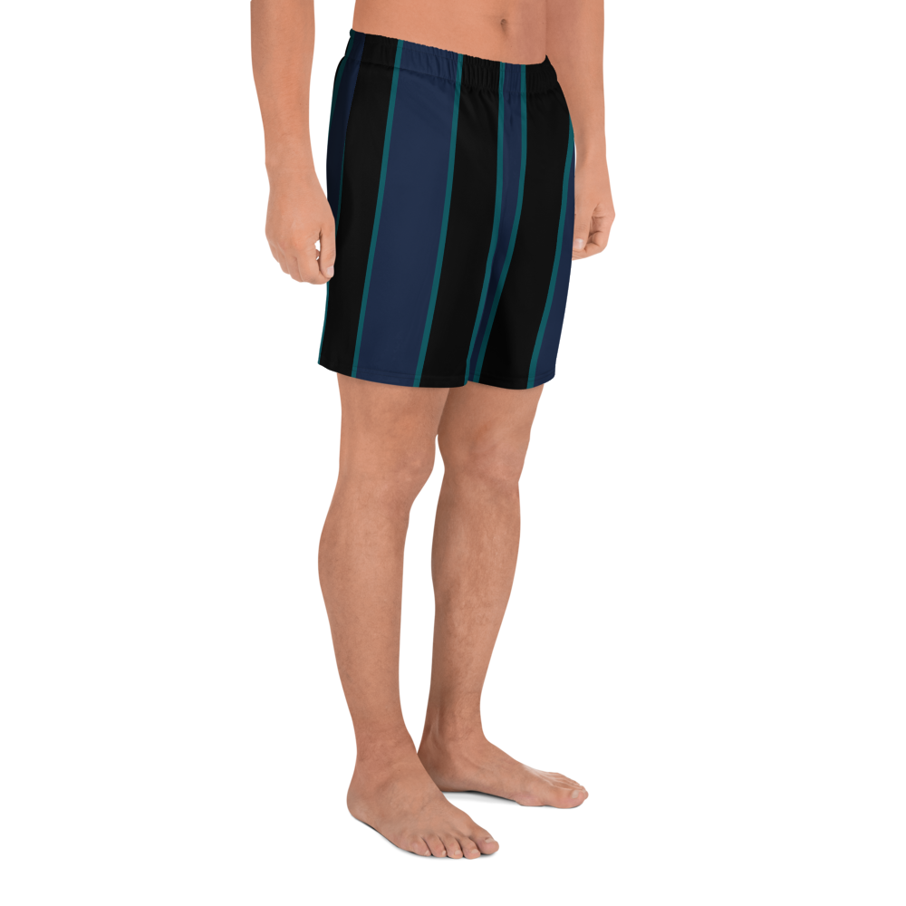 Clean vertical stripes in deep navy and black offer a contemporary look that stands out while maintaining timeless appeal. Vibrant teal lines stretch across the shorts, bringing subtle energy to the overall design. Perfect for afternoon walks or weekend downtime, these shorts blend classic colors with a modern edge, making them a versatile staple for any relaxed wardrobe.