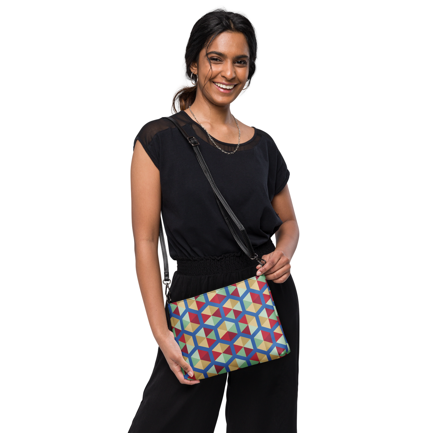 Vibrant geometric shapes interlock across this striking crossbody, offering a burst of retro energy with red, yellow, blue, and mint accents. The unique illusion of three-dimensional cubes adds a playful touch that pairs effortlessly with everyday styles or evening outings, making this accessory the perfect standout piece for the modern wardrobe.