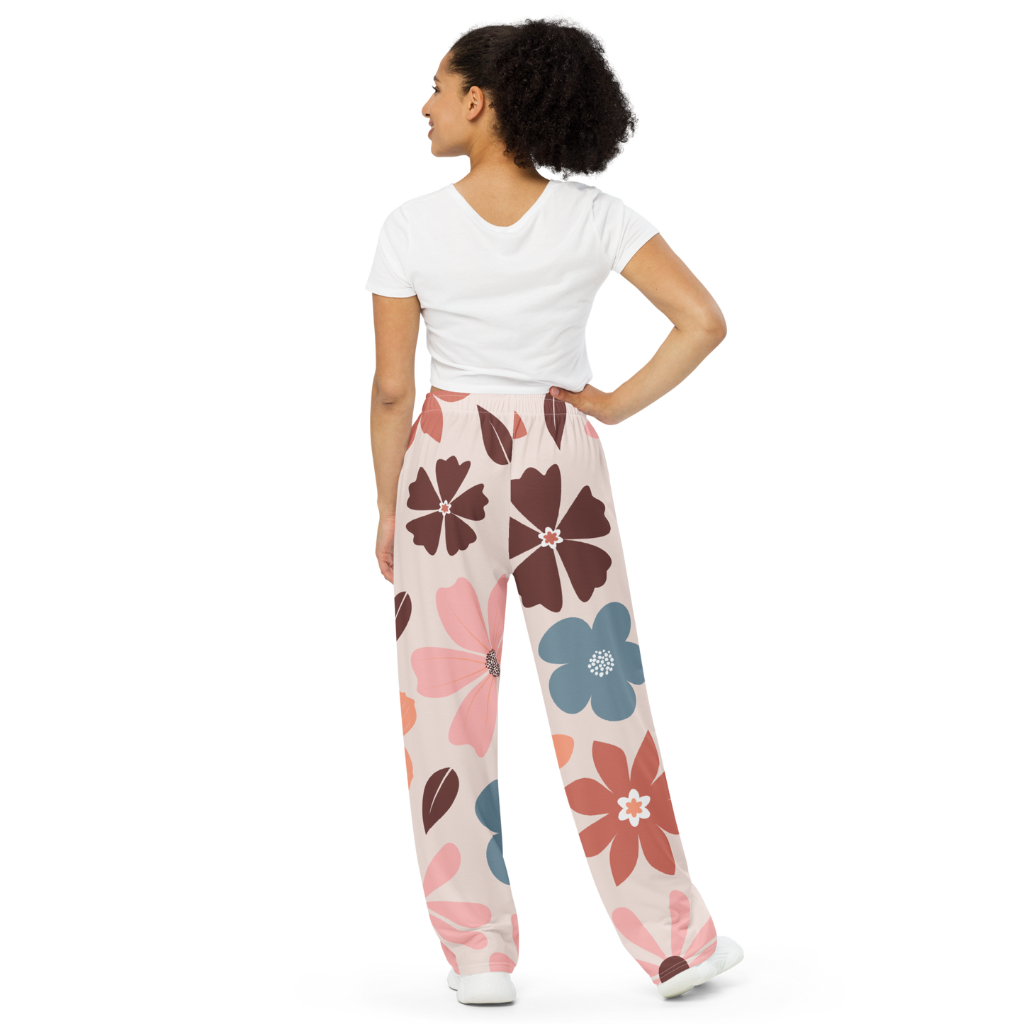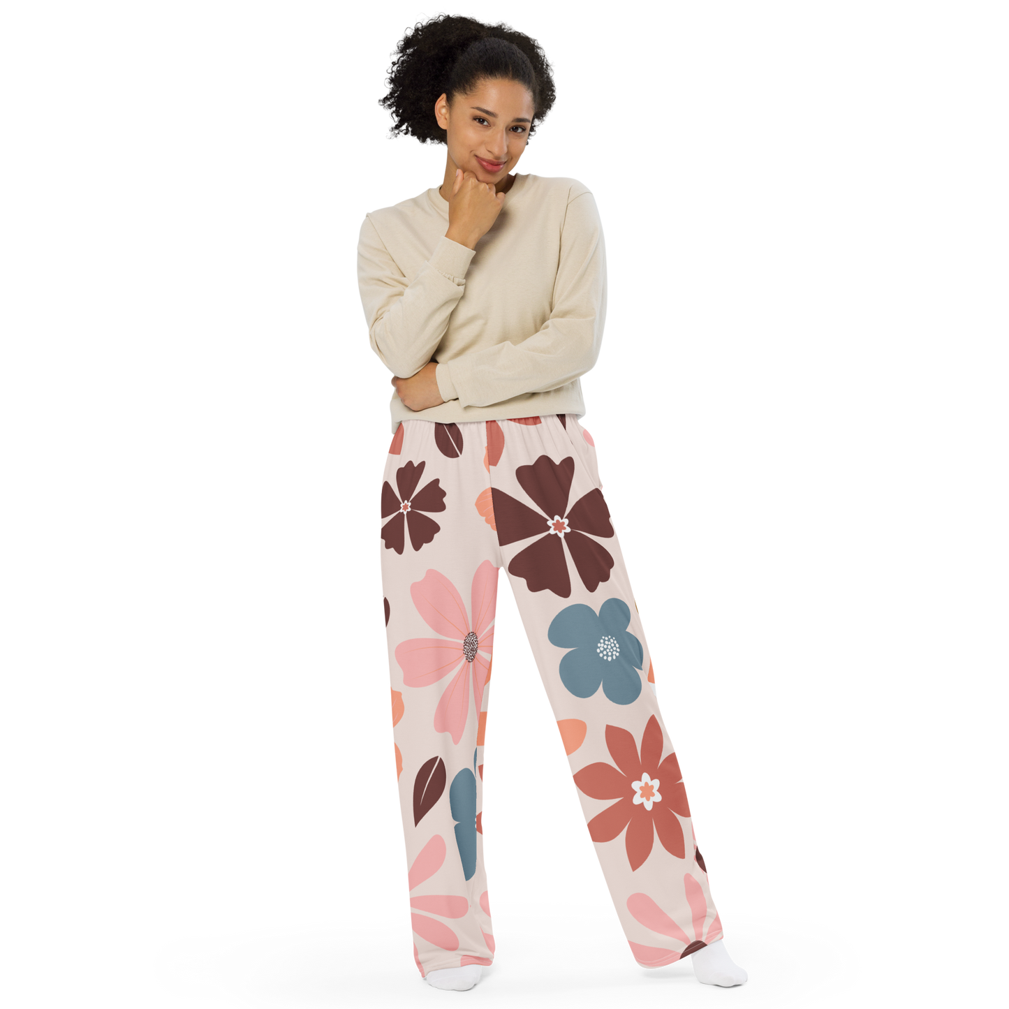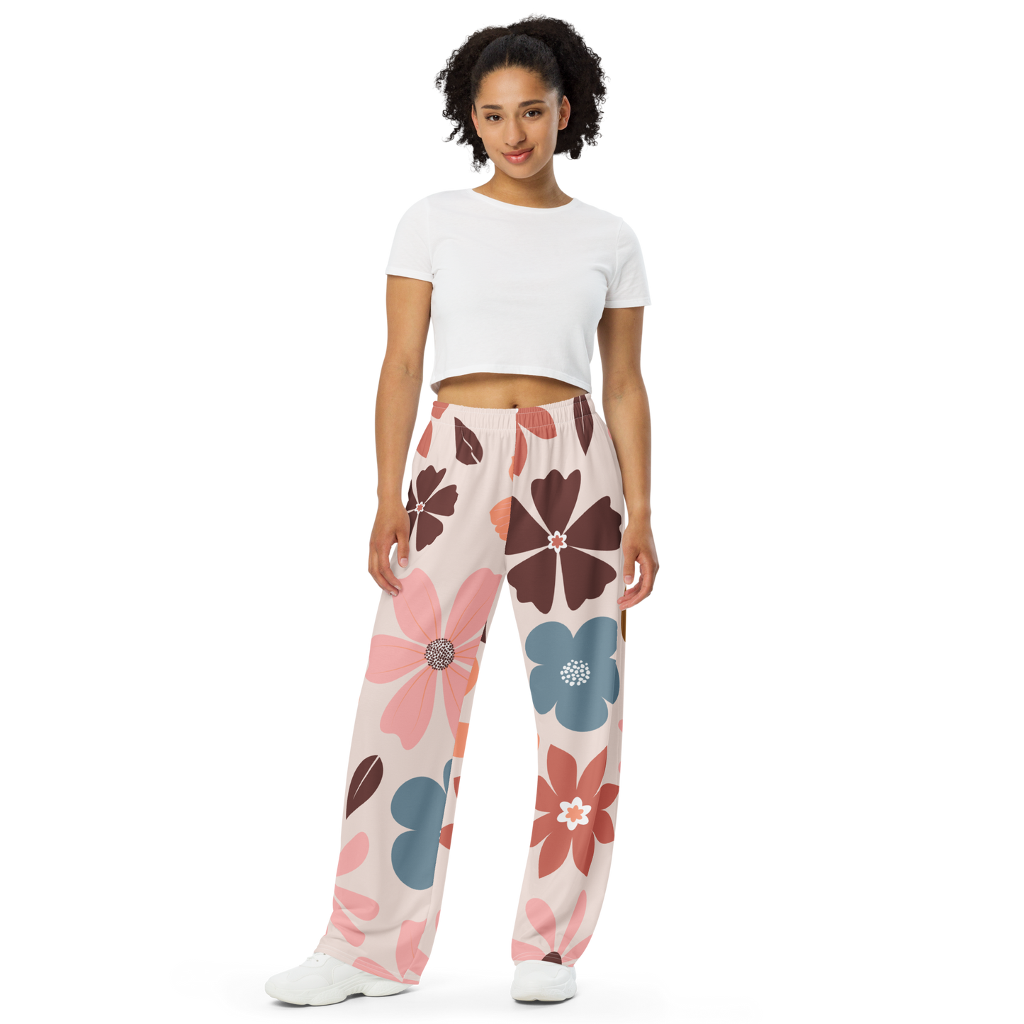 Celebrate lively days and tranquil evenings with these wide-leg pants featuring oversized floral motifs in cheerful shades. The relaxed fit and soft-faded pink background make them a perfect choice for expressing your playful side, while earthy browns, coral, and blue accents add a sophisticated yet whimsical twist to your look. Perfect for making a chic statement, every time you wear them.