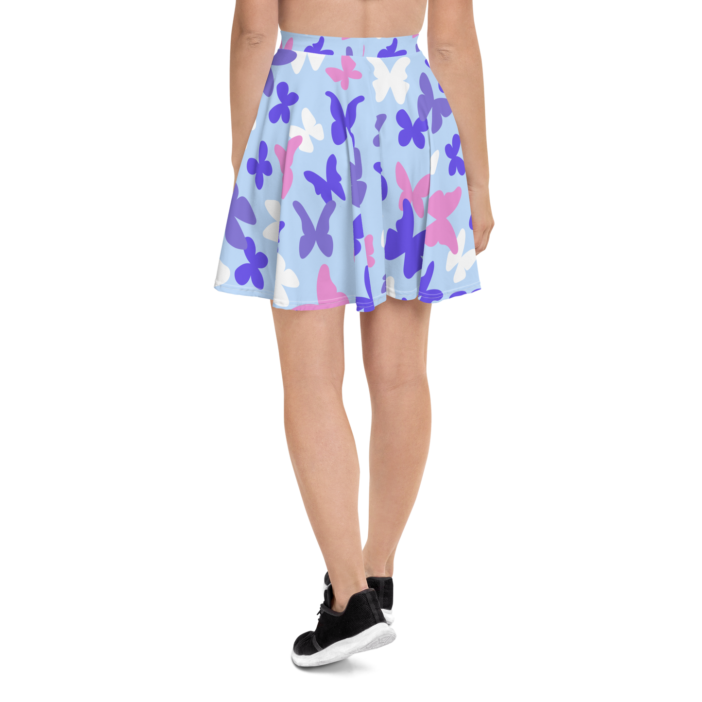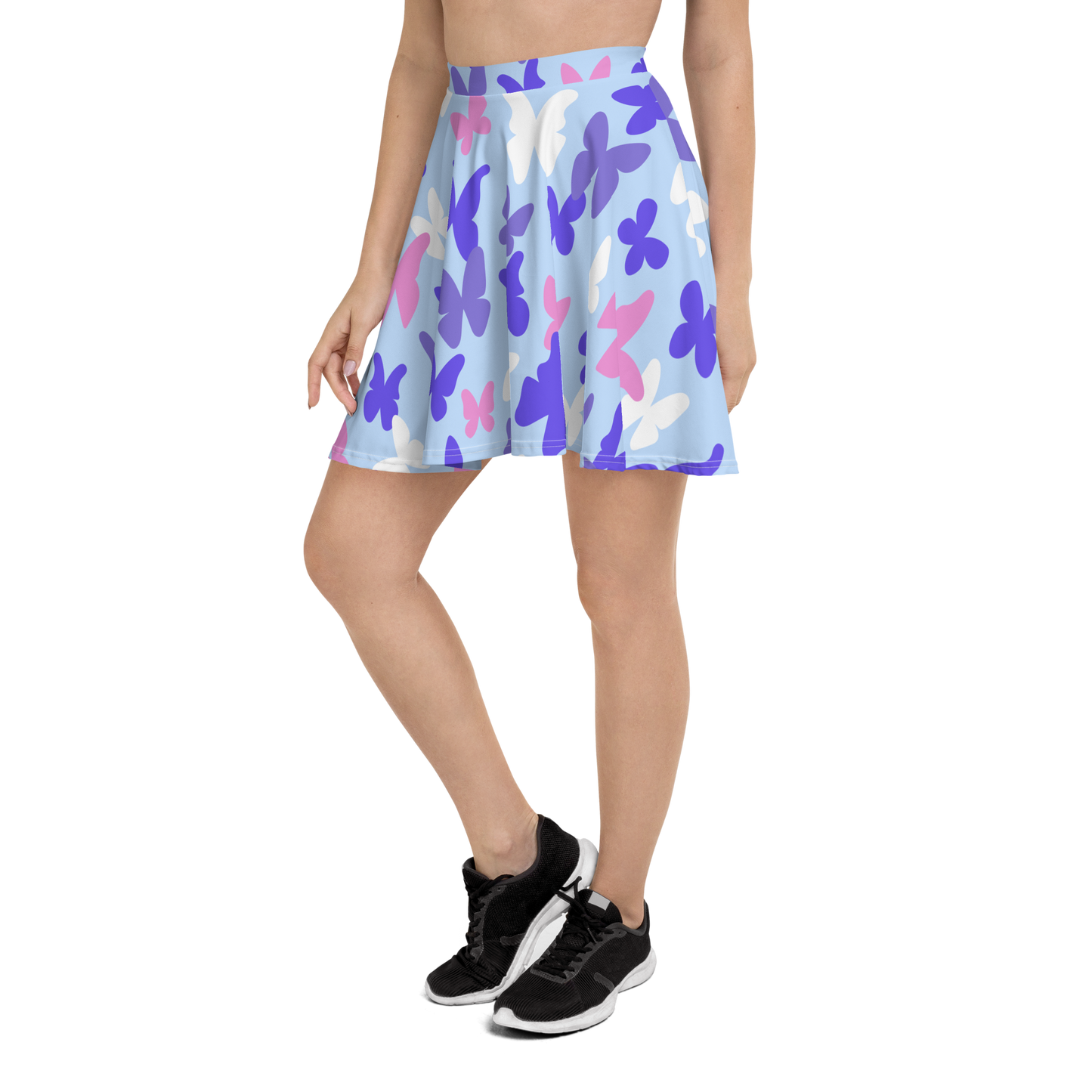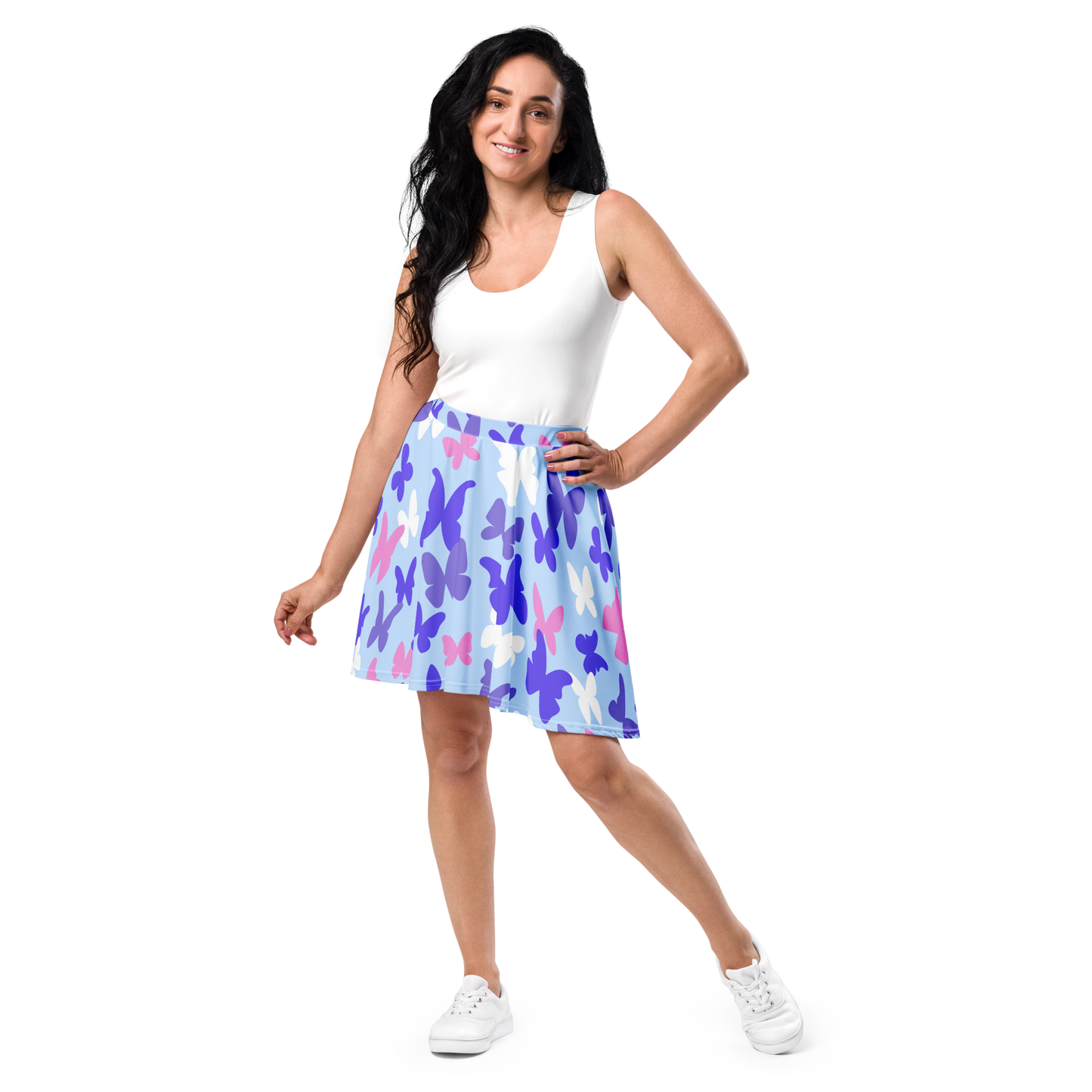 Embrace a whimsical spirit with this flared skirt, featuring a dance of abstract butterflies in soothing shades of blue, purple, and hints of white. The floaty silhouette and cheerful motif create a lively visual perfect for sunny outings and effortless style. It perfectly blends sweet, carefree energy while making any casual moment feel extra special.