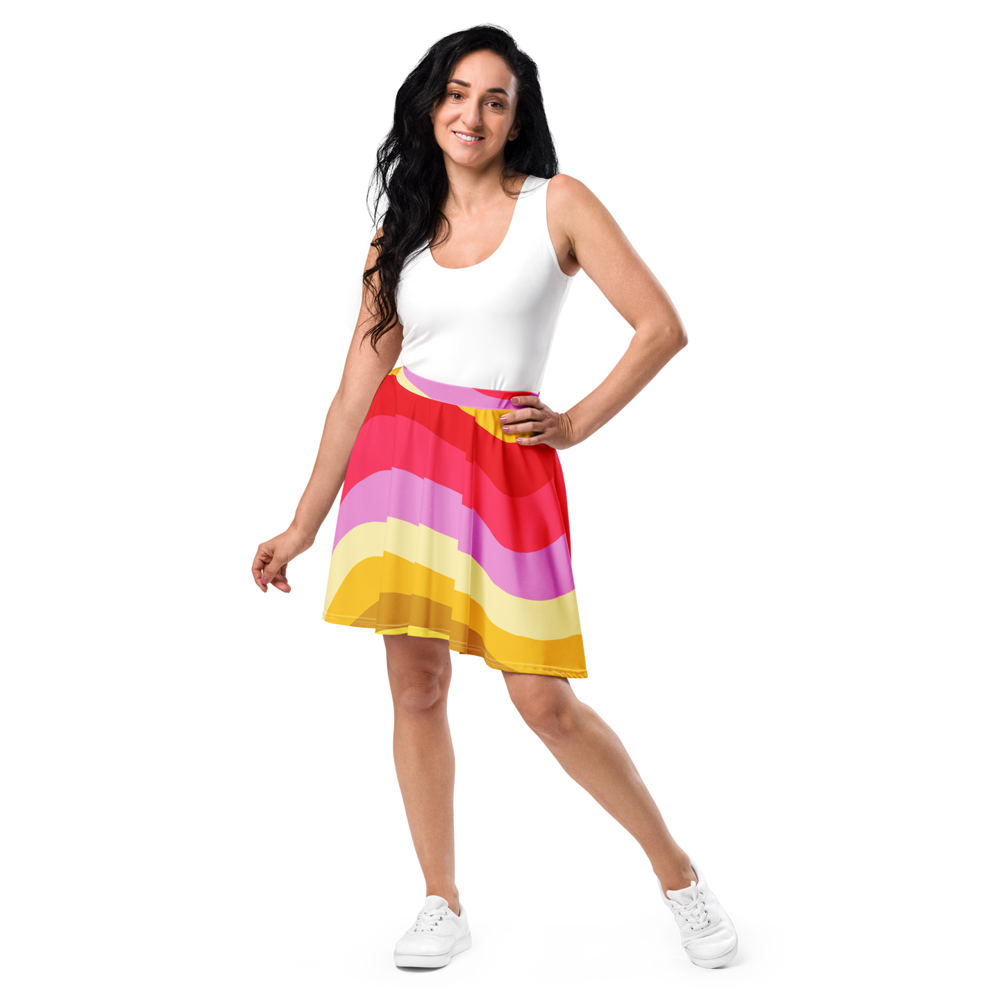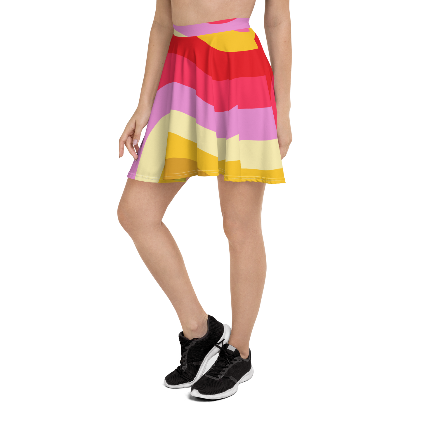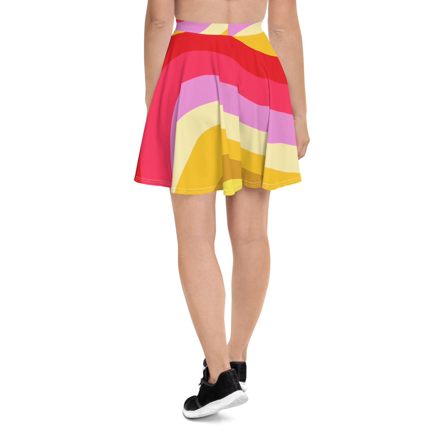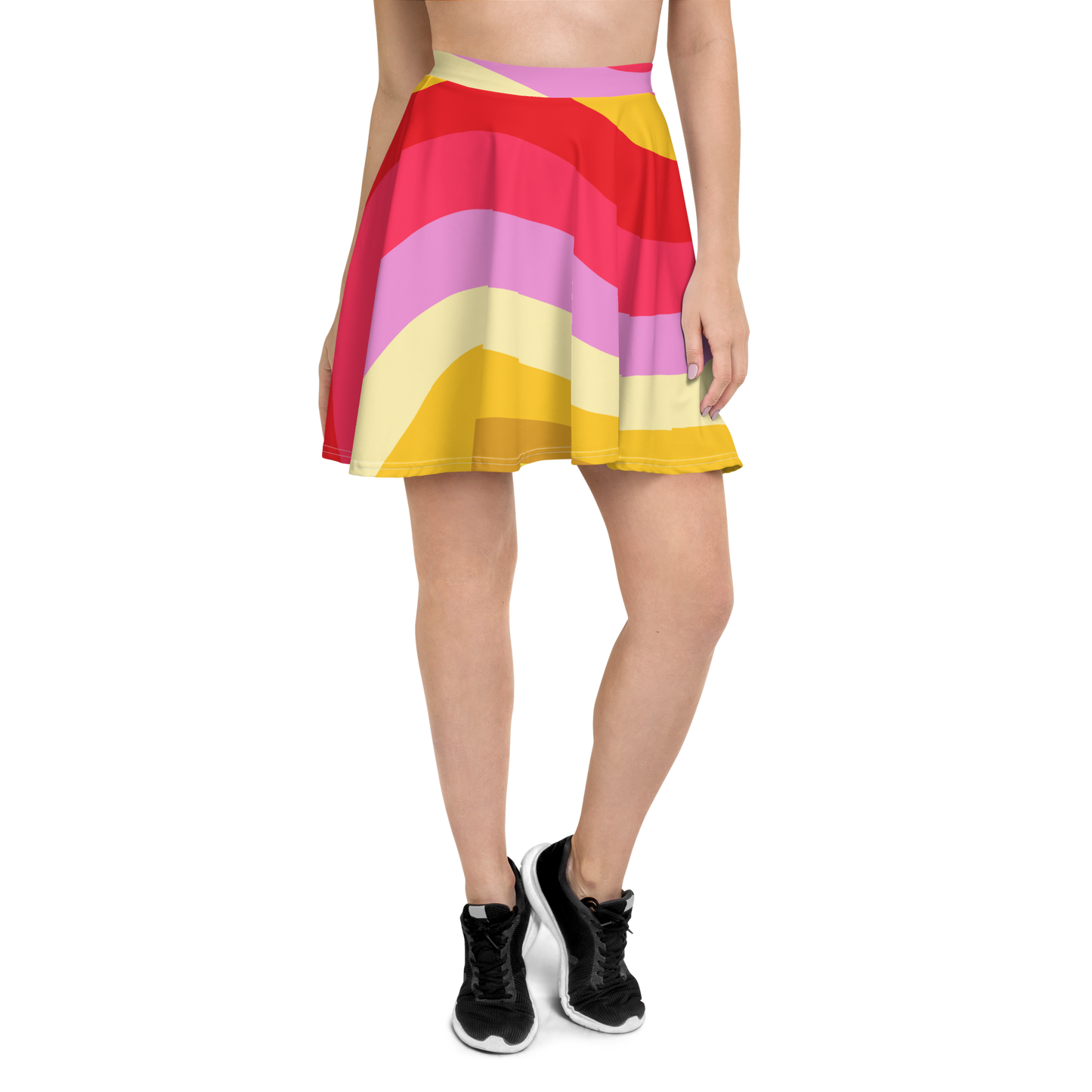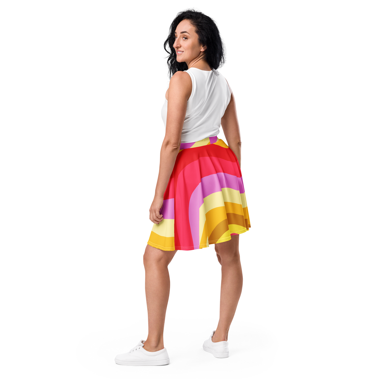 Give your wardrobe a playful update with this cheerful skater skirt, bursting with a colorful mix of wide yellow, pink, and vibrant red bands. The swirling, retro-inspired stripes create a lively look that stands out effortlessly from day to night. Perfect for sunny days out or energetic weekends, it's designed to inspire joy and movement with every step.