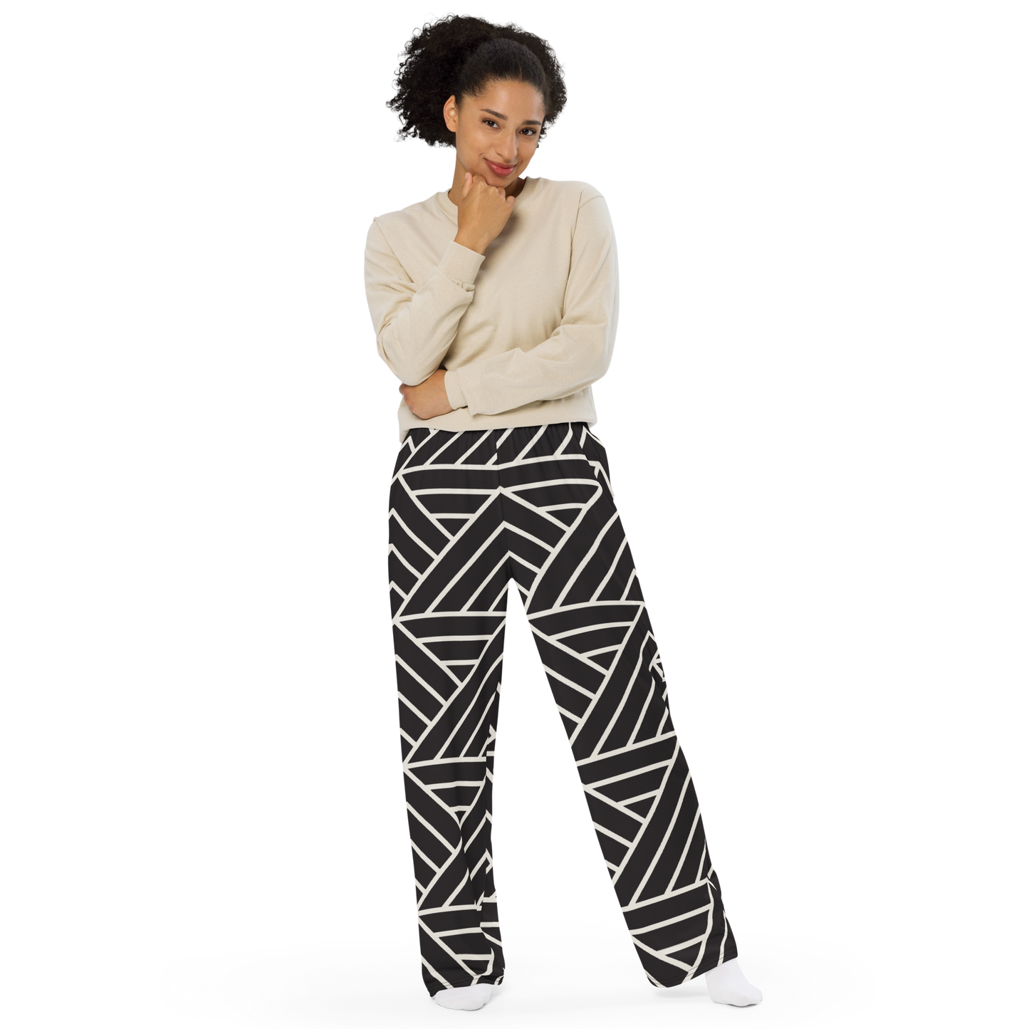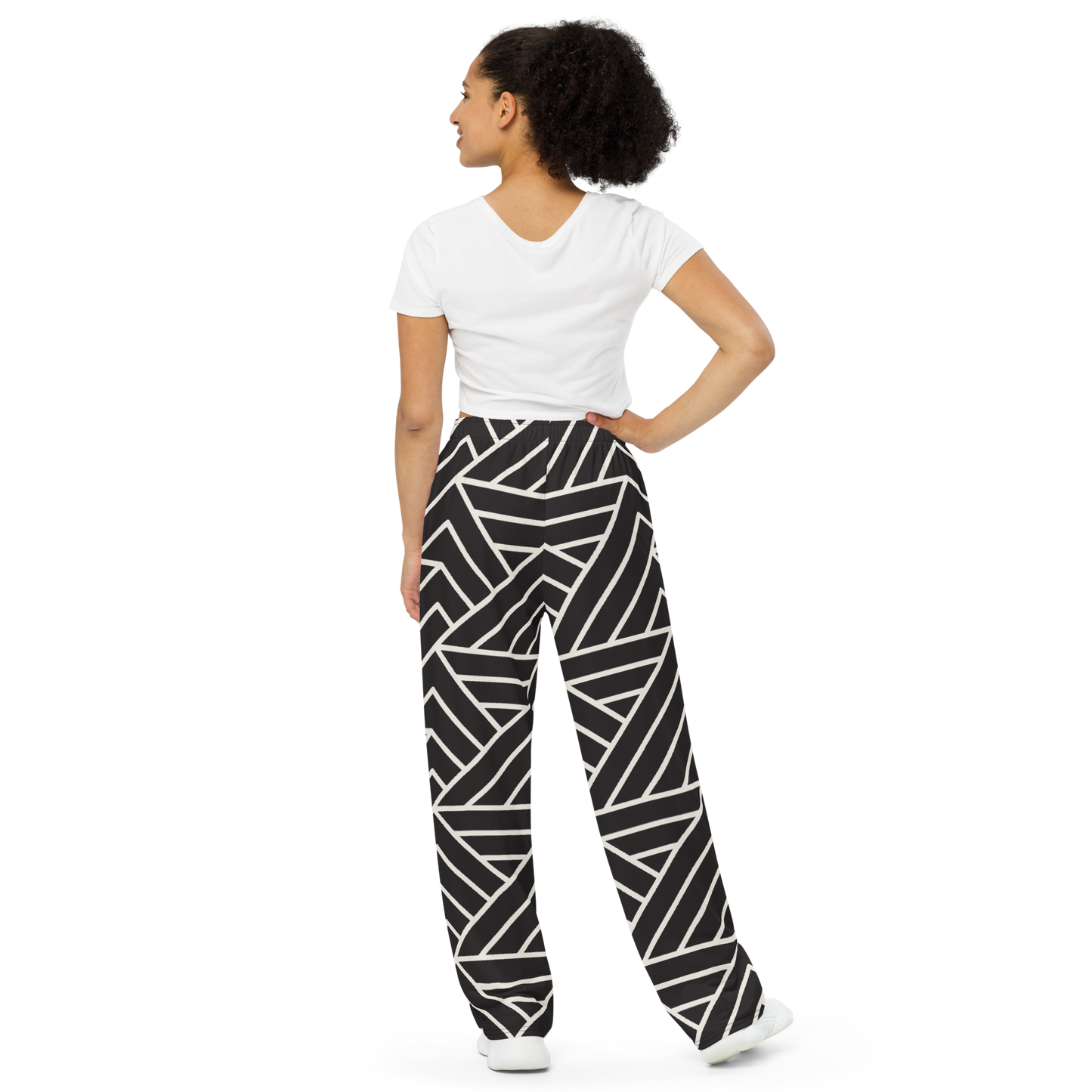 Make a bold impression with these wide-leg pants designed with crisp white intersecting lines over a rich black base. A dynamic, artful vision, this pattern is made for those who appreciate confident style. Comfortable yet striking, these pants are perfect for standing out at any urban gathering or simply elevating your everyday look with sophistication.