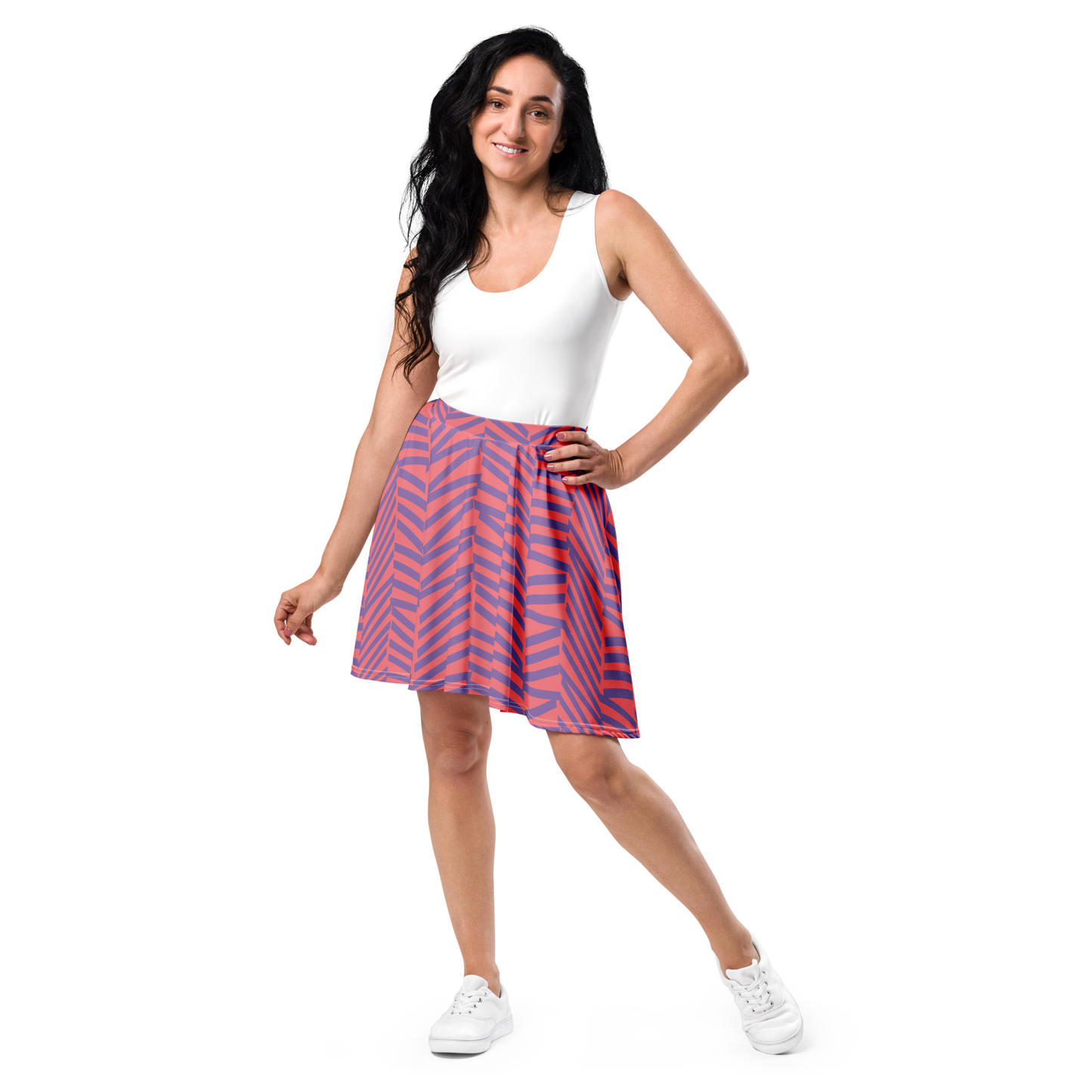 Step out with confidence in this lively skirt, featuring a dynamic chevron pattern that captures the spirit of fun and movement. The vibrant warm hue is complemented by bold blue stripes, creating a look that's energetic and unique. Perfect for adding a burst of personality to your wardrobe—pair it with a simple top and let your style take center stage.