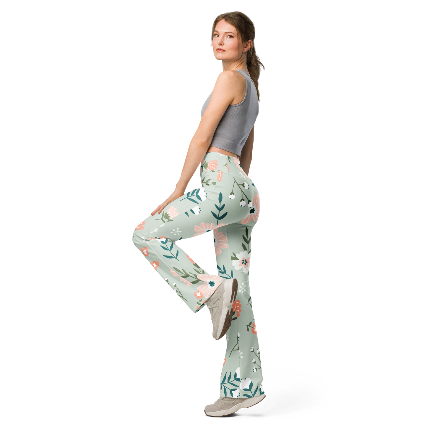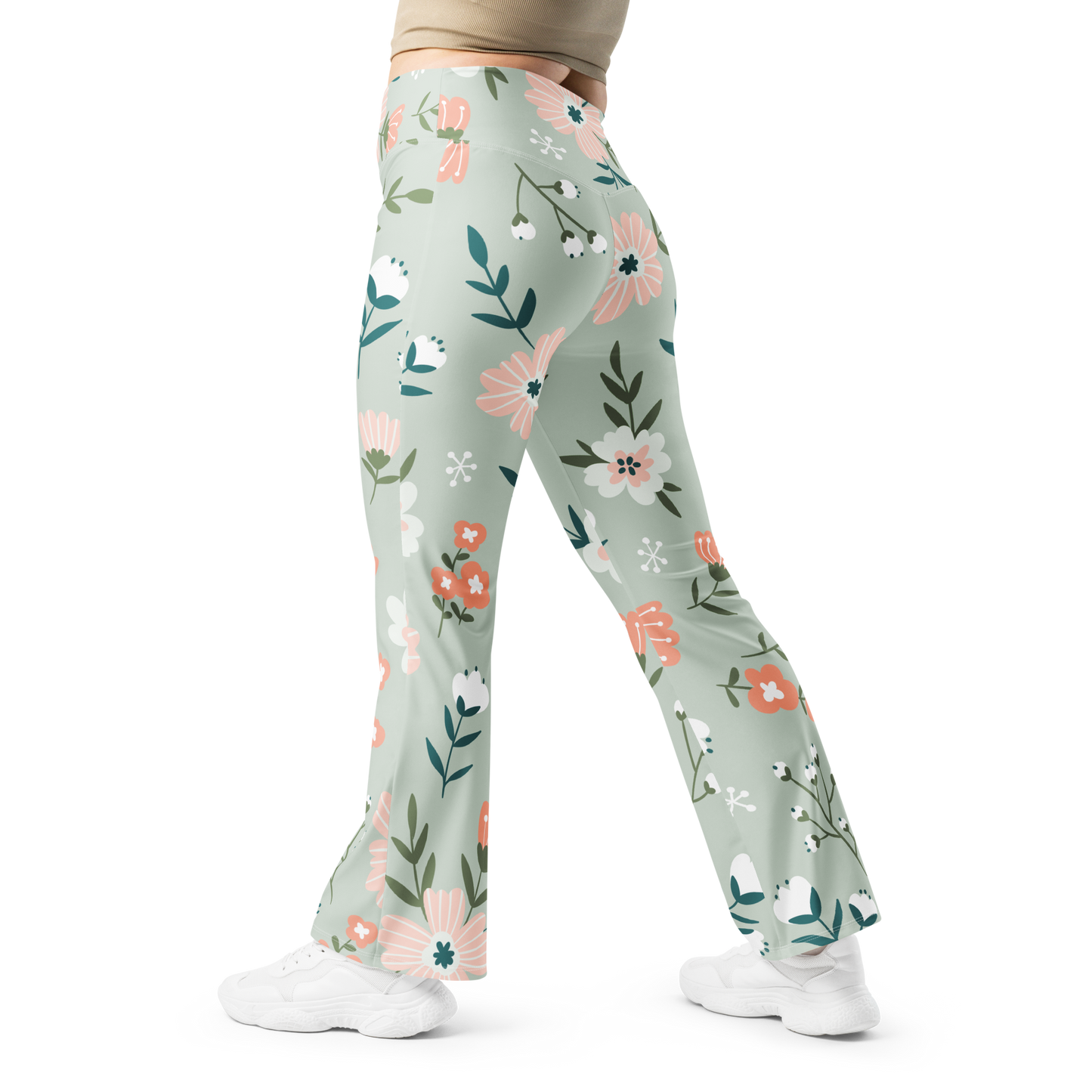 Wake up every day in cheerful style with these leggings, adorned with soft pink and white blossoms over a gentle sage-inspired backdrop. The playful, oversized flower pattern sets a spirited mood, making them a favorite for workouts or casual outings. Their inviting hues bring a sense of natural grace to any outfit, perfectly balancing charm and comfort all day long.