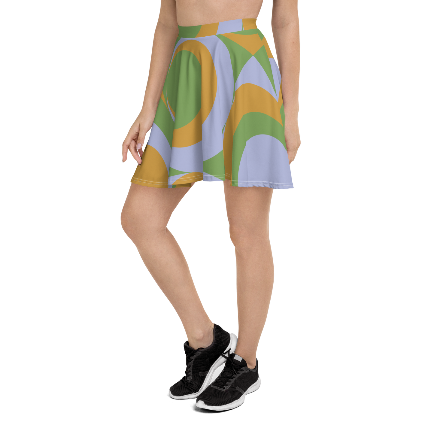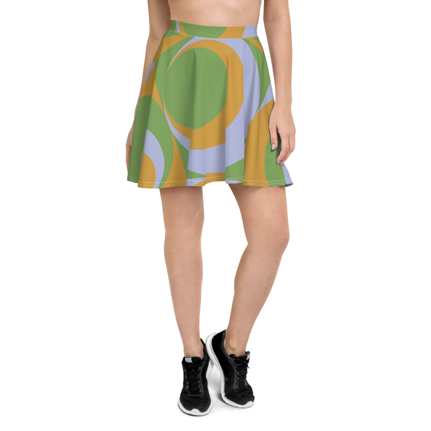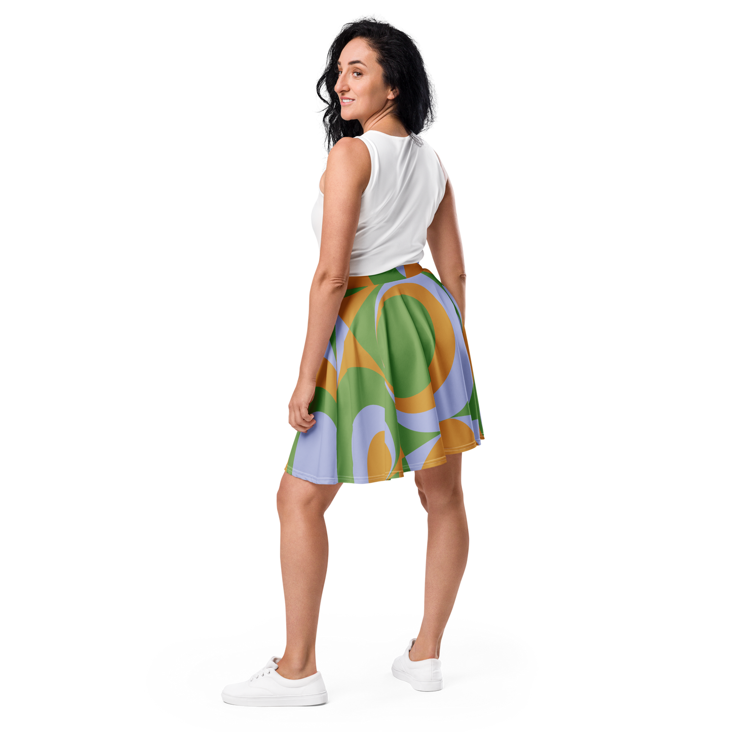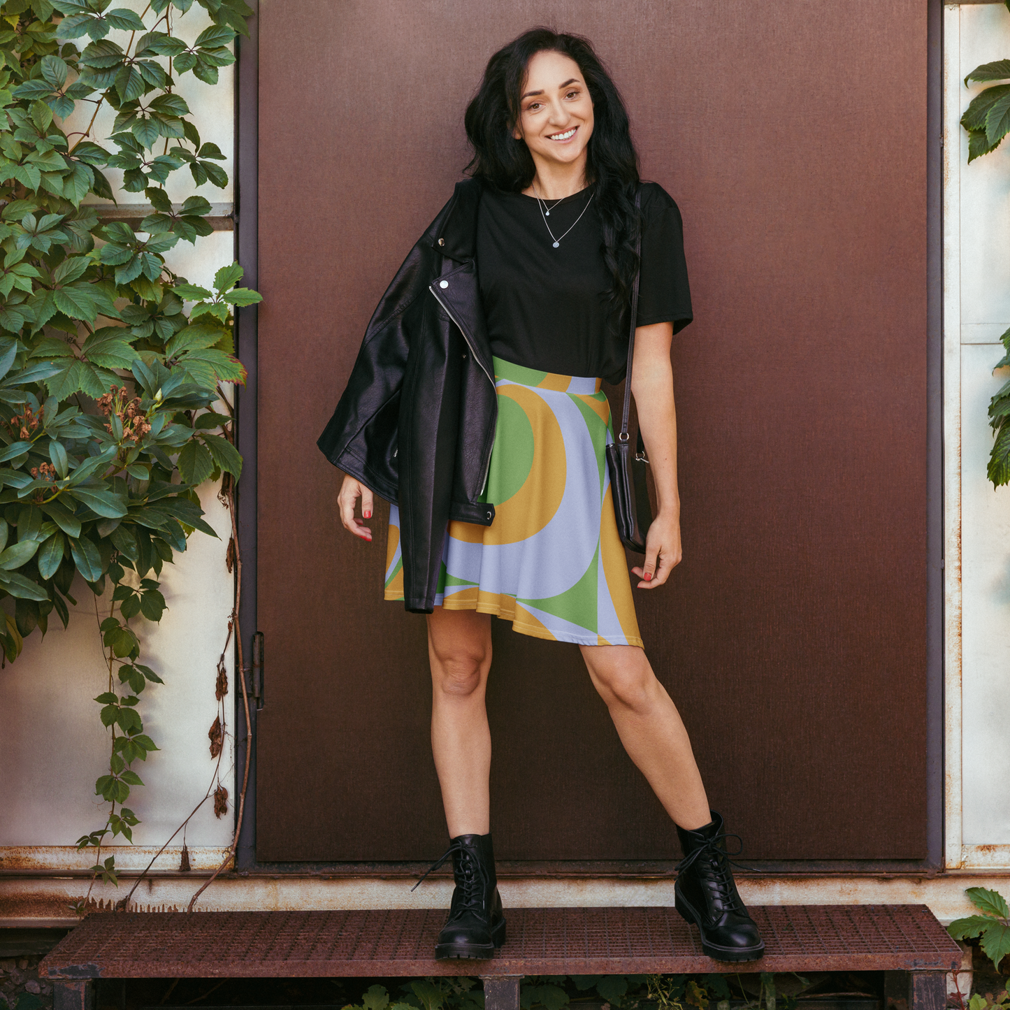 Refreshing swirls and lively circles dance across this playful skater skirt, combining soft green, gentle yellow, and cool blue tones in a retro-inspired motif. The fluid movement and cheerful palette make it a standout for everyday styling, adding an energetic pop to any look and ensuring a carefree charm that effortlessly brightens the day.