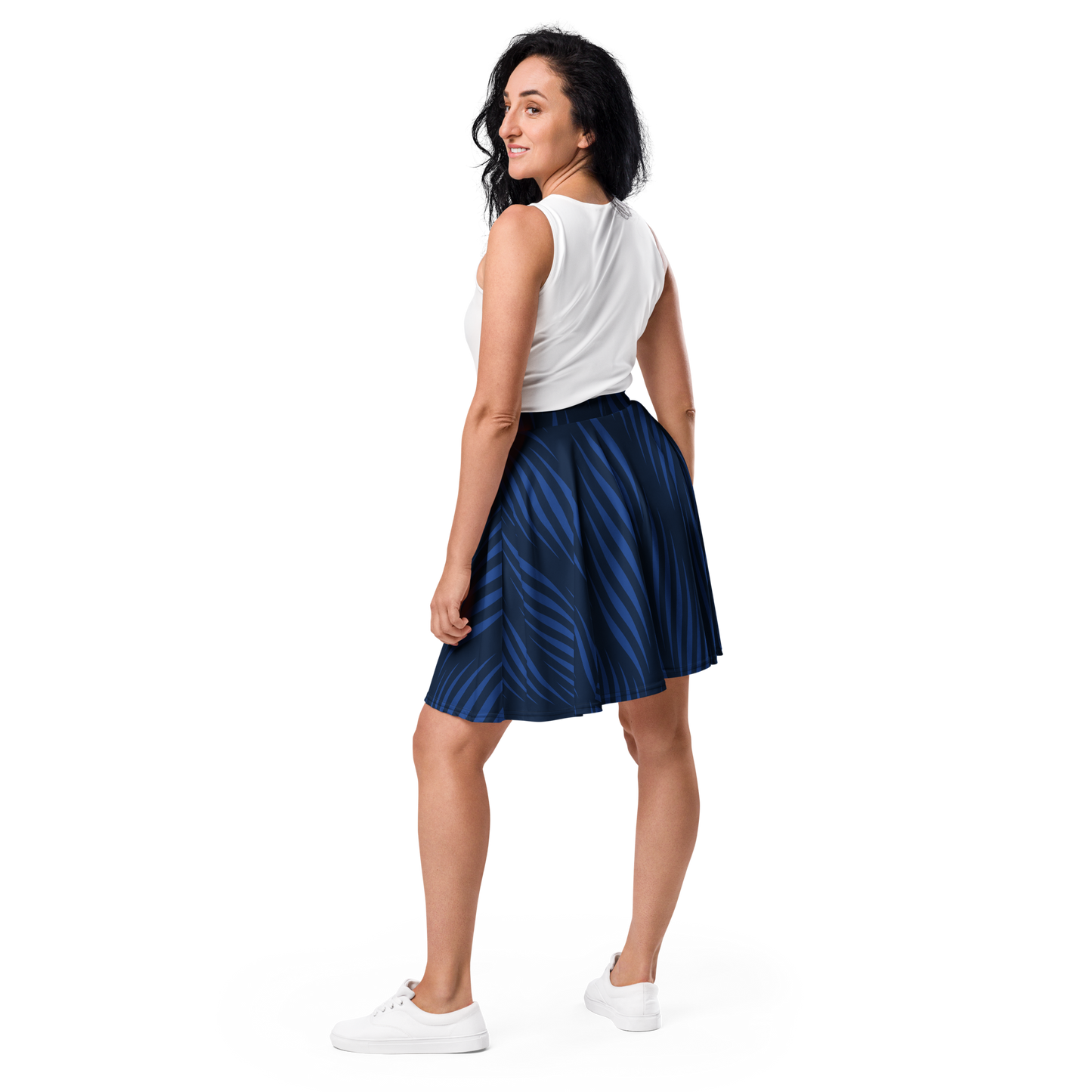 Flowing lines in deep indigo and blue create an eye-catching, breezy effect that's both stylish and versatile. The easy-to-wear skater skirt silhouette makes it perfect for casual outings or evening ensembles. Pair it with your favorite top for a look that feels effortlessly chic and on-trend from day to night.