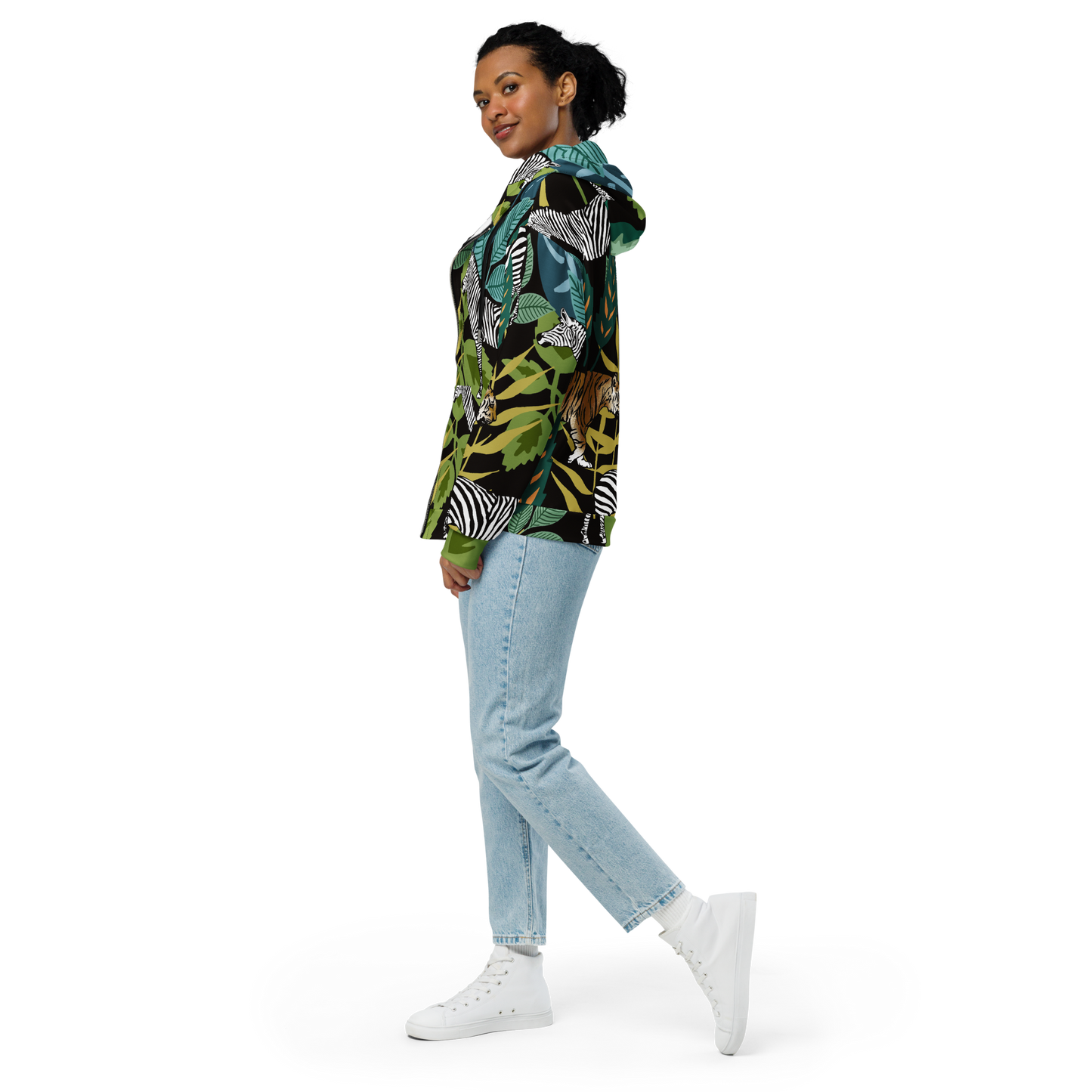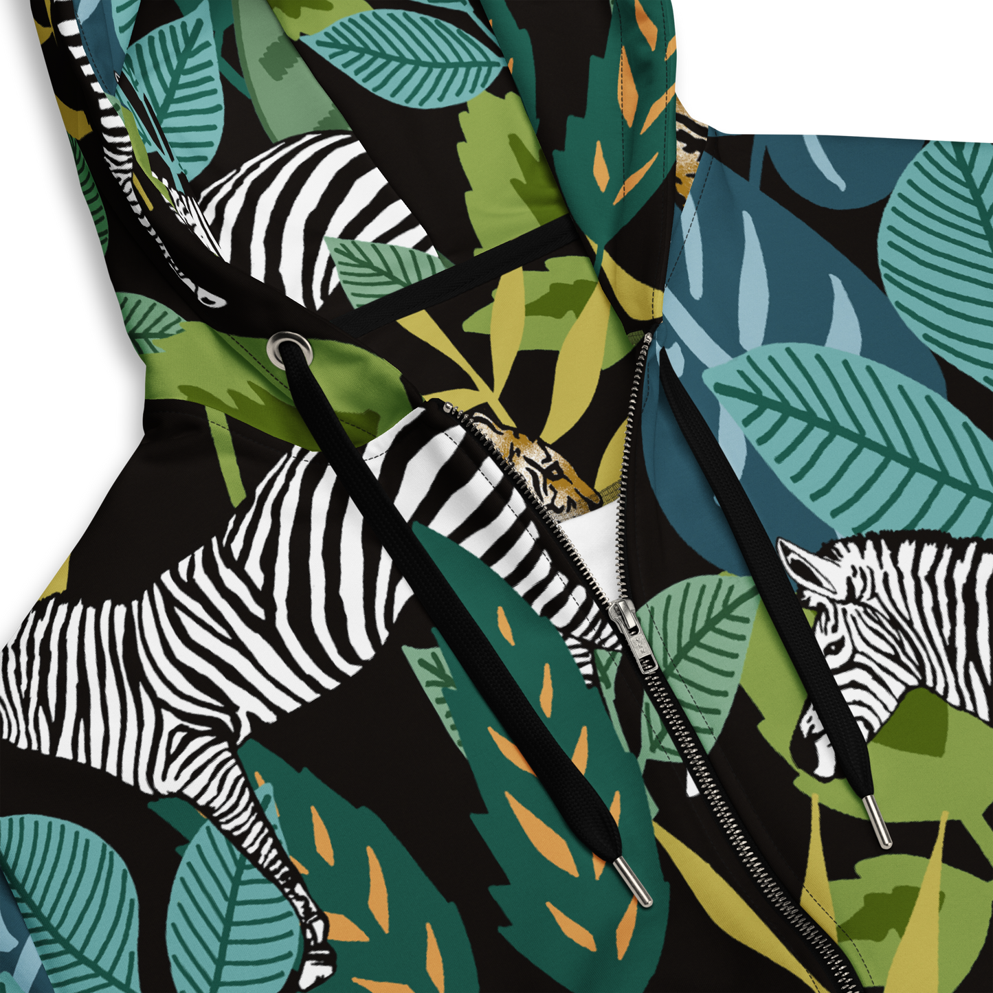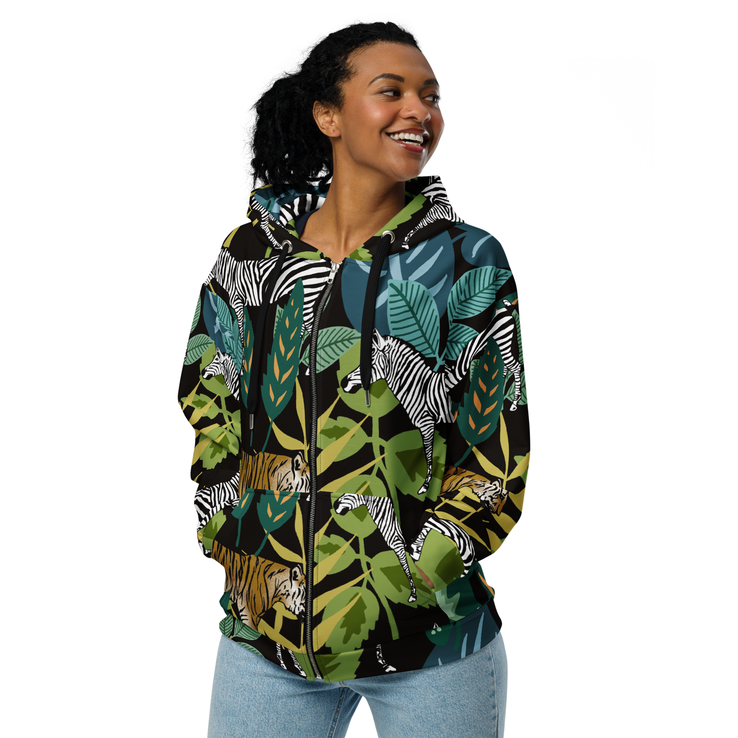 Exotic foliage and wild fauna come together in a dramatic display that instantly transports you to a lush retreat. Deep jungle greens, hints of yellow, and bold patterns with tigers and zebras create a look that captures the adventure of the wilderness. Effortlessly striking, this unique hoodie delivers a splash of safari spirit for your everyday style.