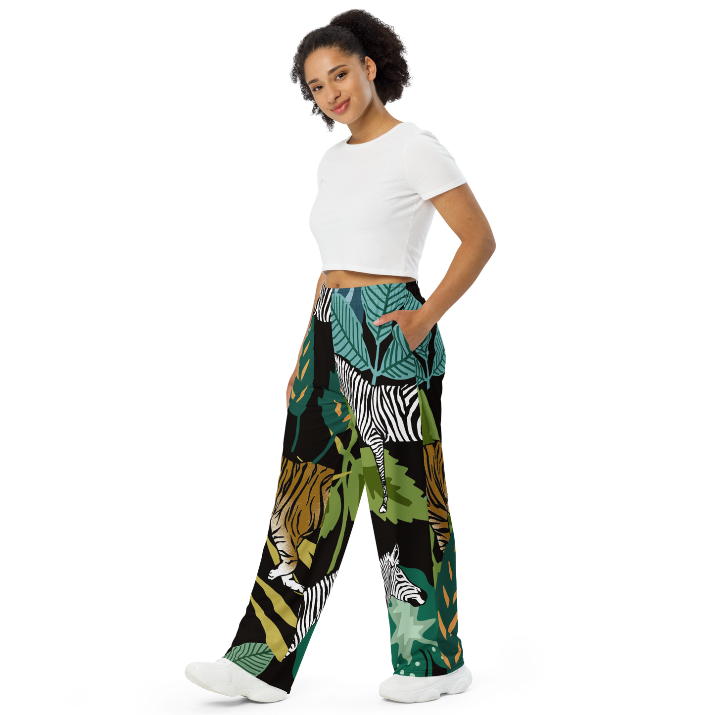 Venture into playful style with wide-leg pants featuring bold zebra stripes, leafy greens, and tawny tiger accents. The vibrant jungle theme and relaxed fit create an energetic look for daytime strolls or casual evenings. Let every movement pop with a fierce combination of black and vivid colors that catch every eye in the room.