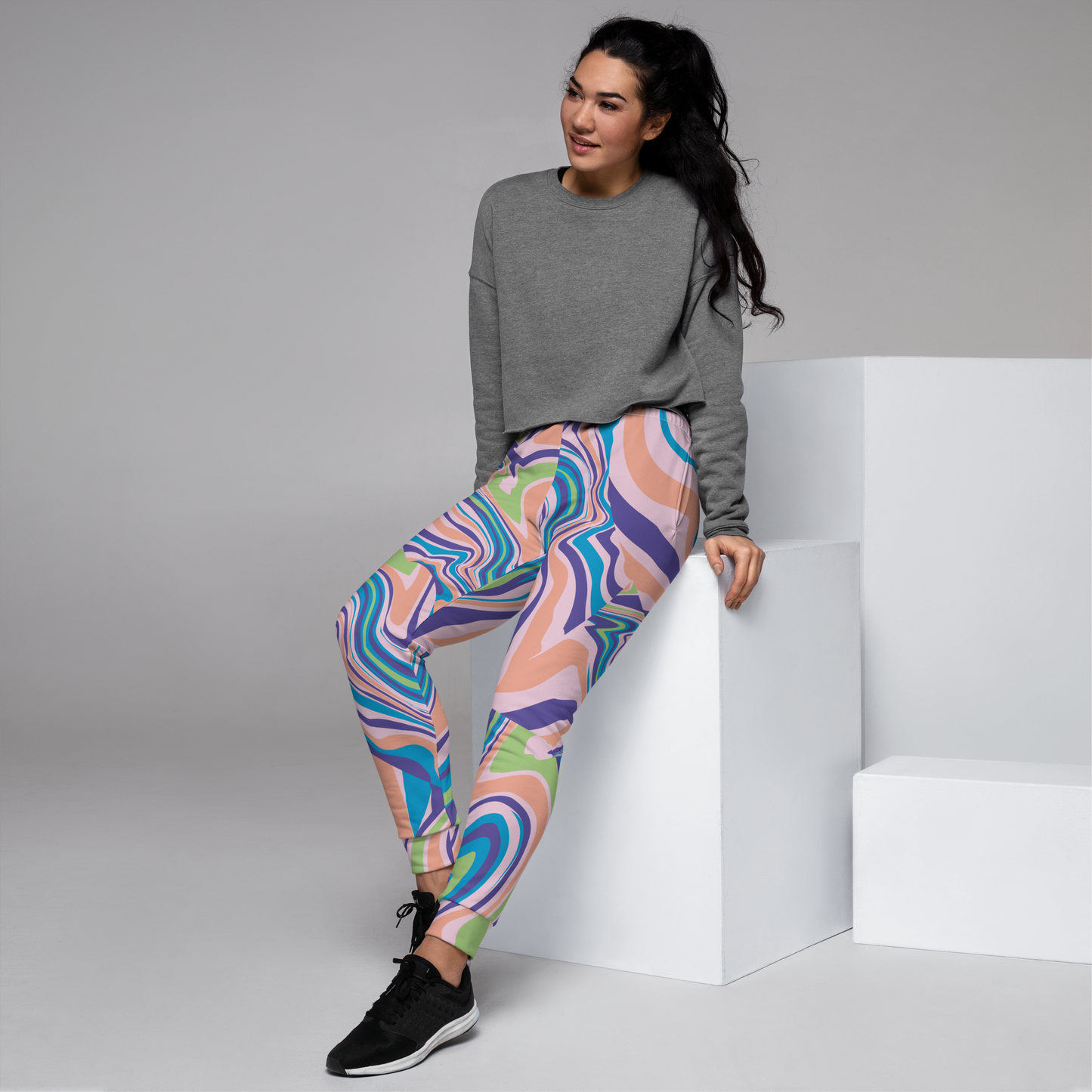 Enliven any wardrobe with this lively pair of joggers, featuring flowing marbled lines in peach, blue, green, and purple. The artistic design brings a fun fusion of breezy hues, perfect for laid-back days or energetic adventures. Soft fabric and an energetic palette make these joggers a standout choice for comfort with a magnetic style. Move with confidence and flair.