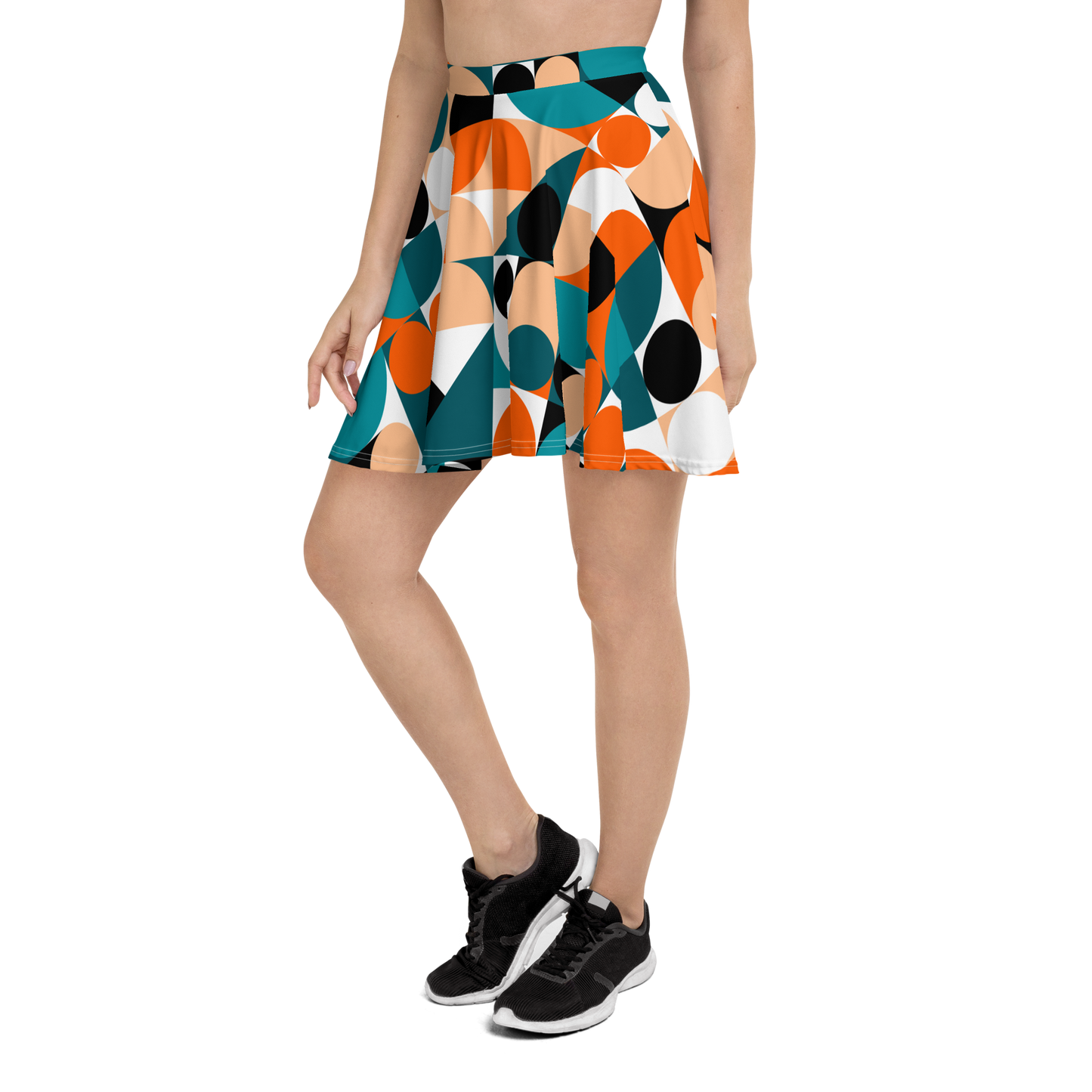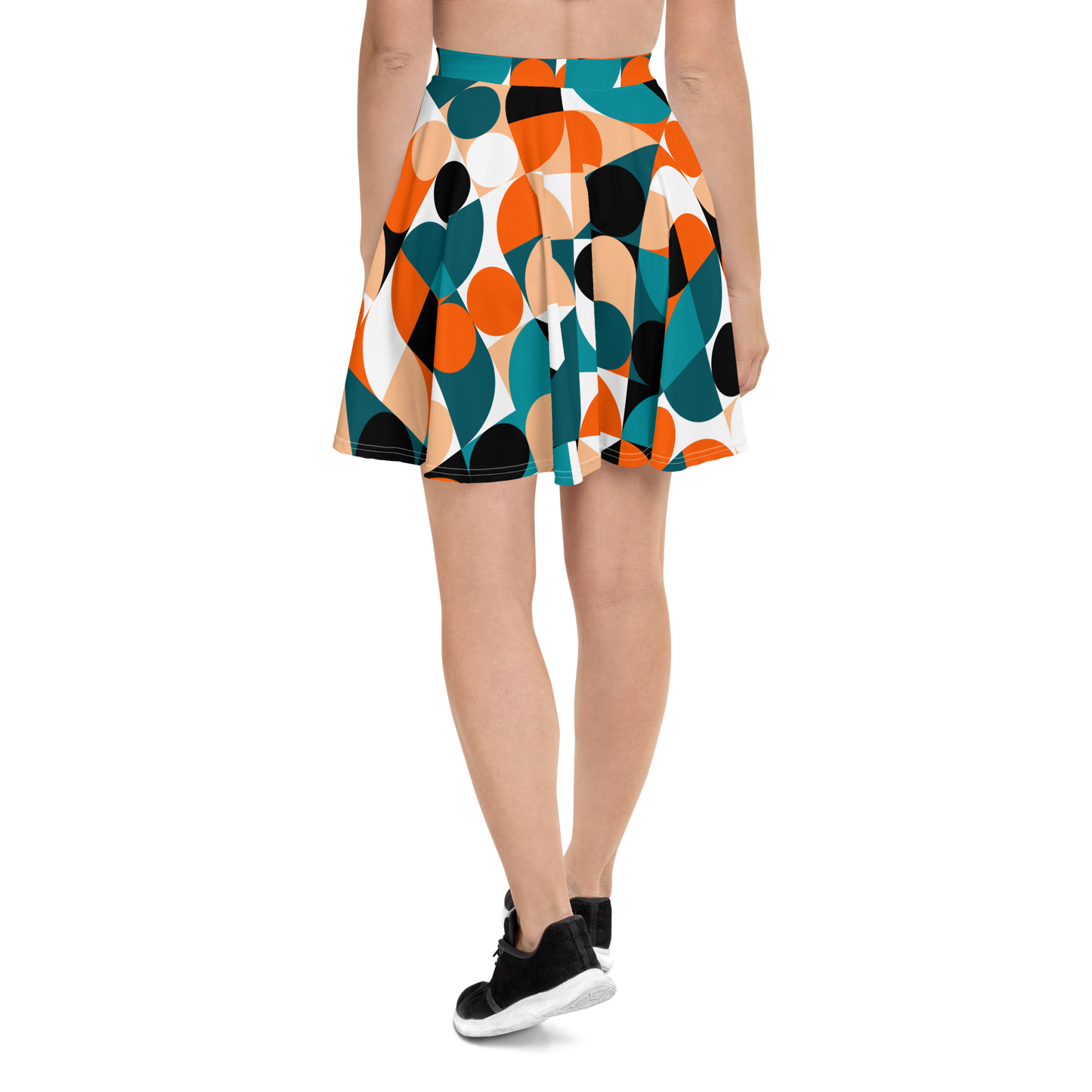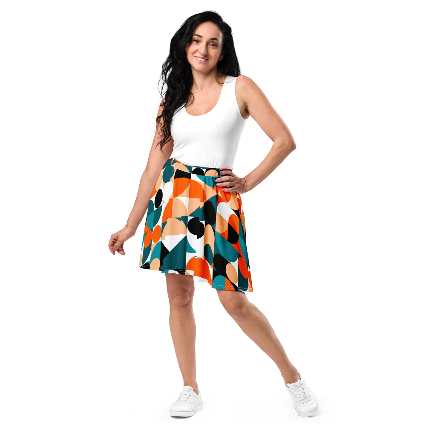 Infused with dynamic circles in bold orange and teal, this skater skirt brings excitement and movement to your outfit. The lively pattern pairs energizing shapes with crisp contrast, making it a standout piece for day or night. Soft, vibrant tones make this skirt a fun choice for those who love a playful, artistic look with a modern feel.