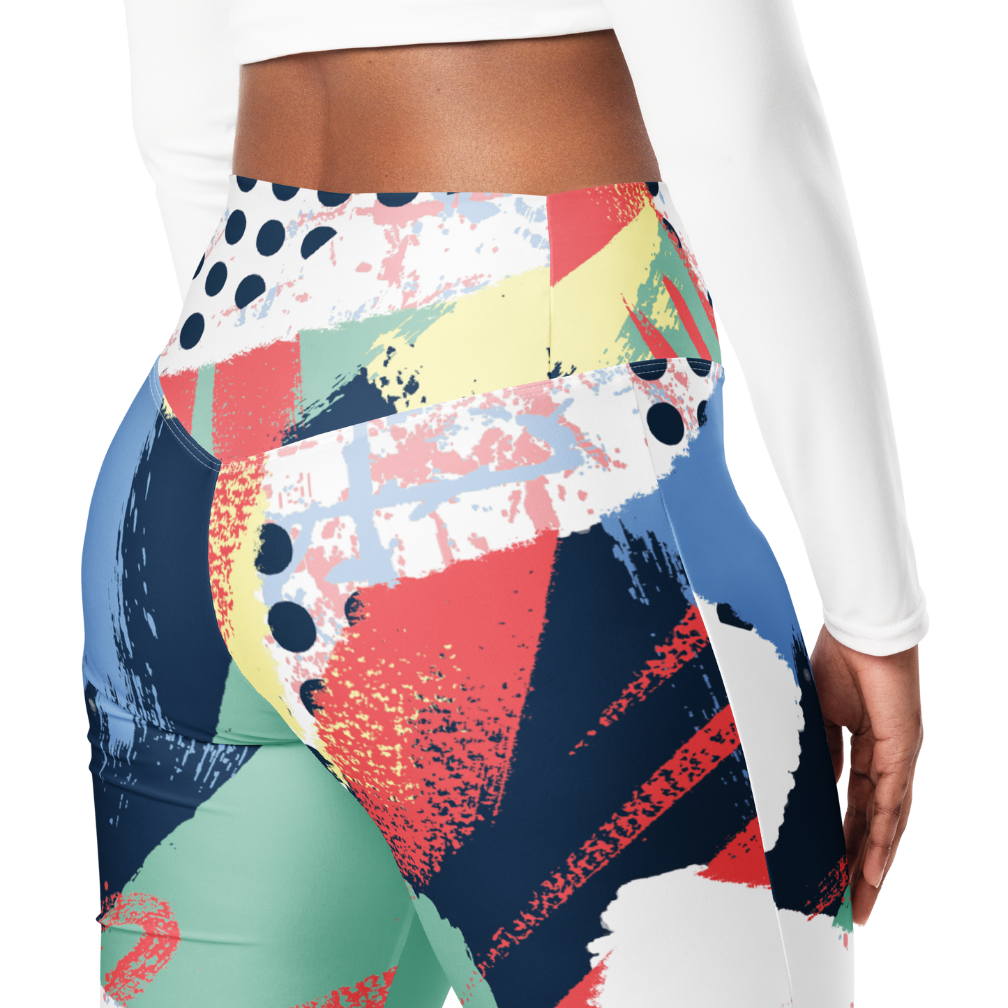 Show off your unique style with these high-waist flare leggings featuring a playful mix of bold stripes, painterly swashes, and oversized polka dots. The crisp white background brings together energizing touches of red, yellow, blue, and green for a contemporary look that stands out from every angle. Add extra fun and flair to any routine with this unmistakable statement piece.