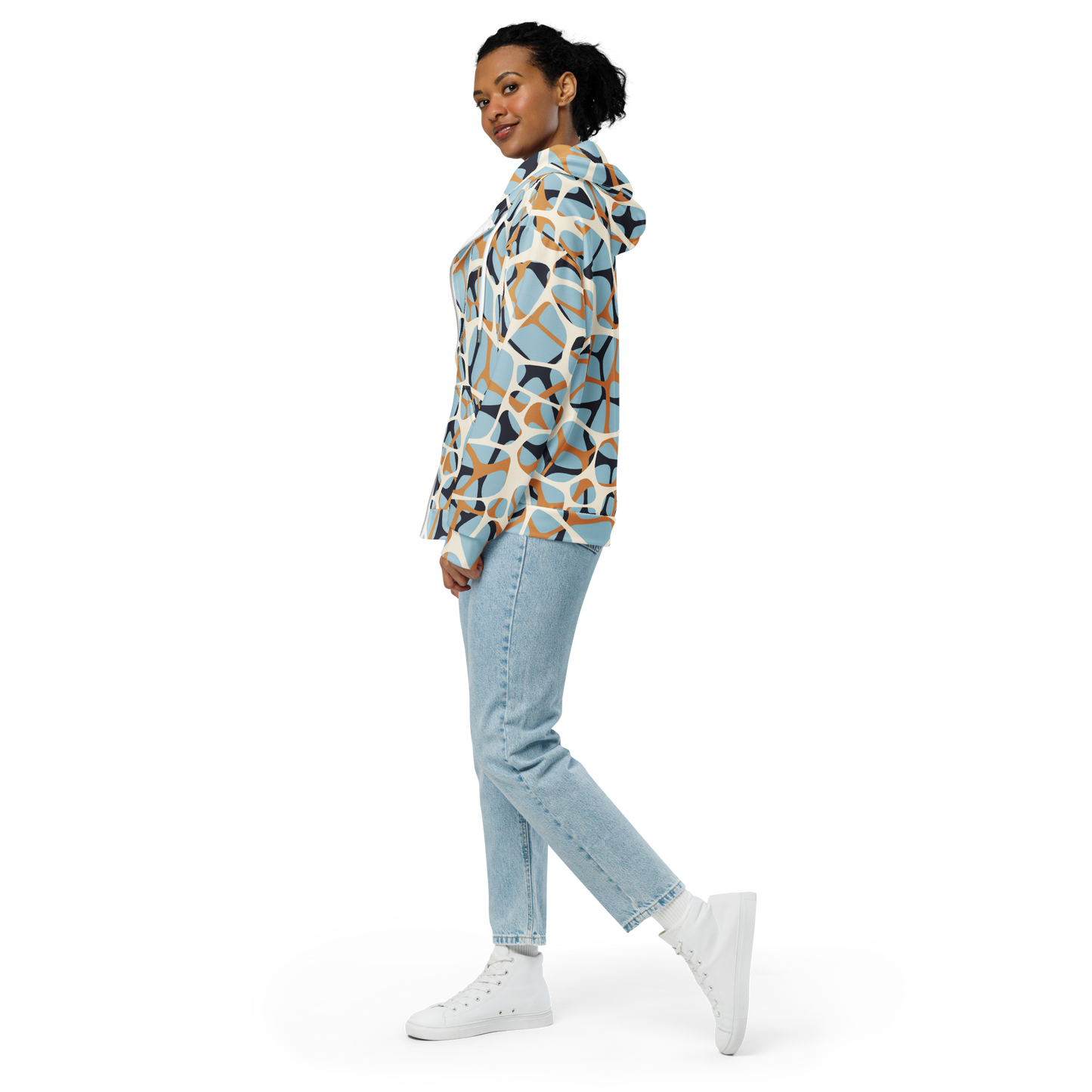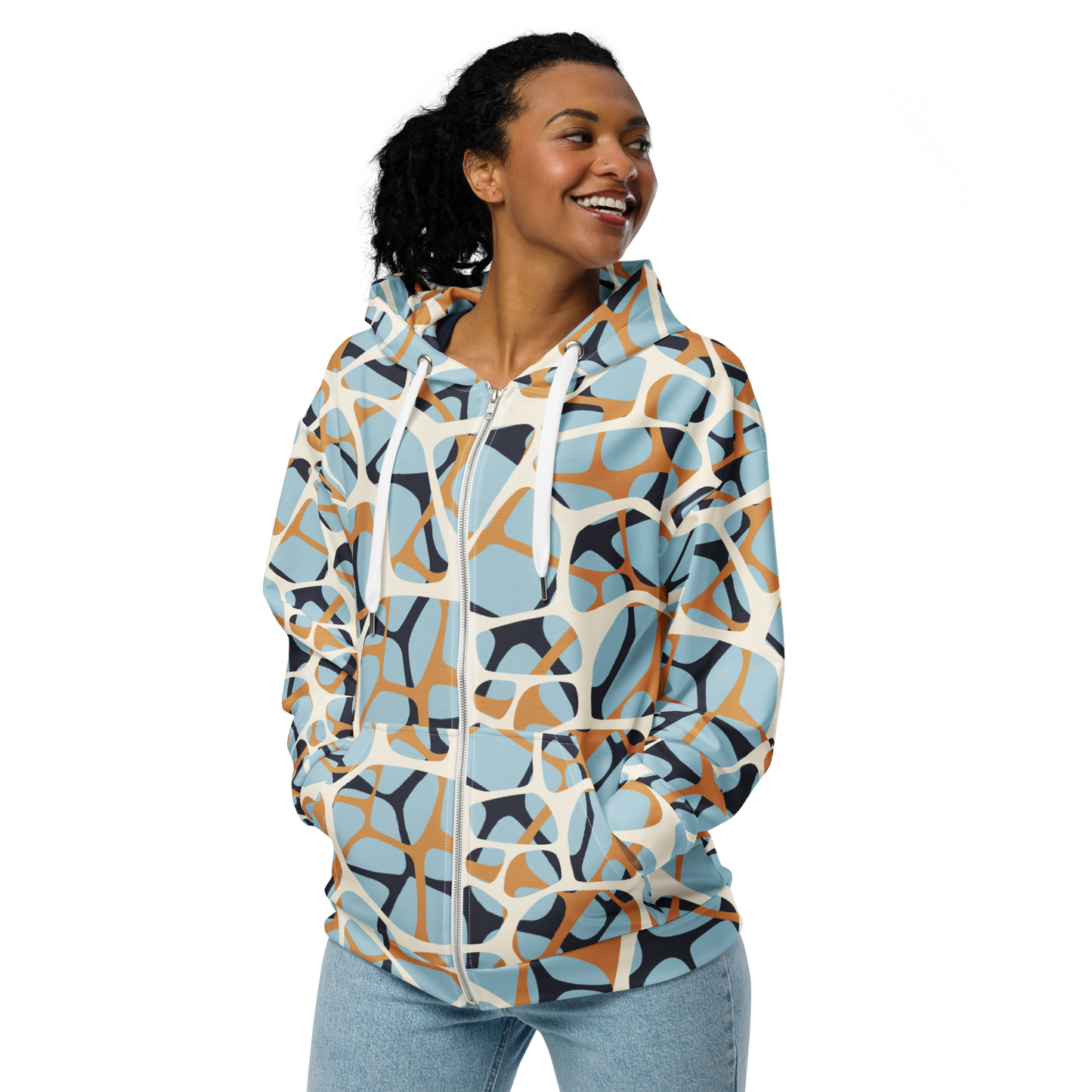 Inspire your everyday with energetic lines and circles weaving across a frosty blue canvas. Beautiful caramel and navy accents create playful contrast, making this hoodie a fresh way to bring a cool, contemporary style into your look. Perfect for breezy days and casual adventures, this artful layer offers a bold aesthetic for self-expression.